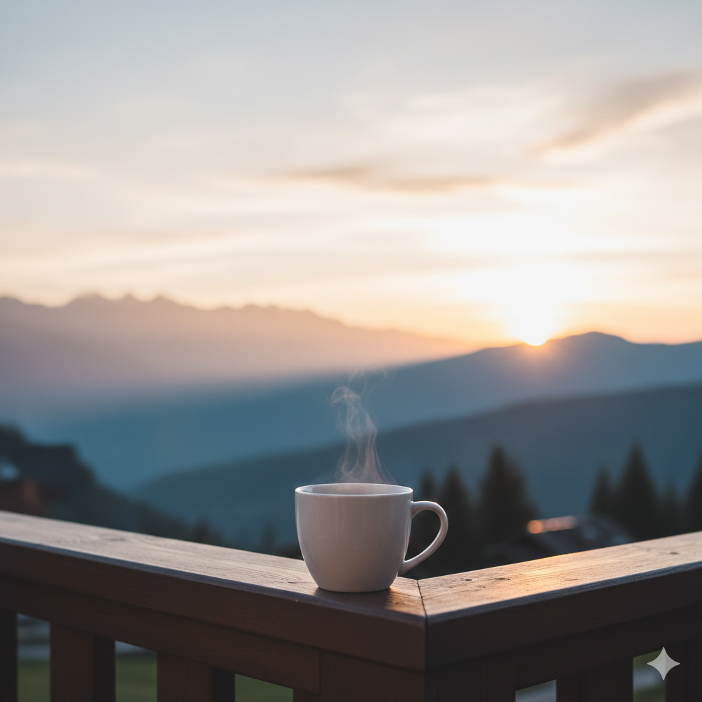 a wooden terrace in the Alps with thick socks and hot coffee